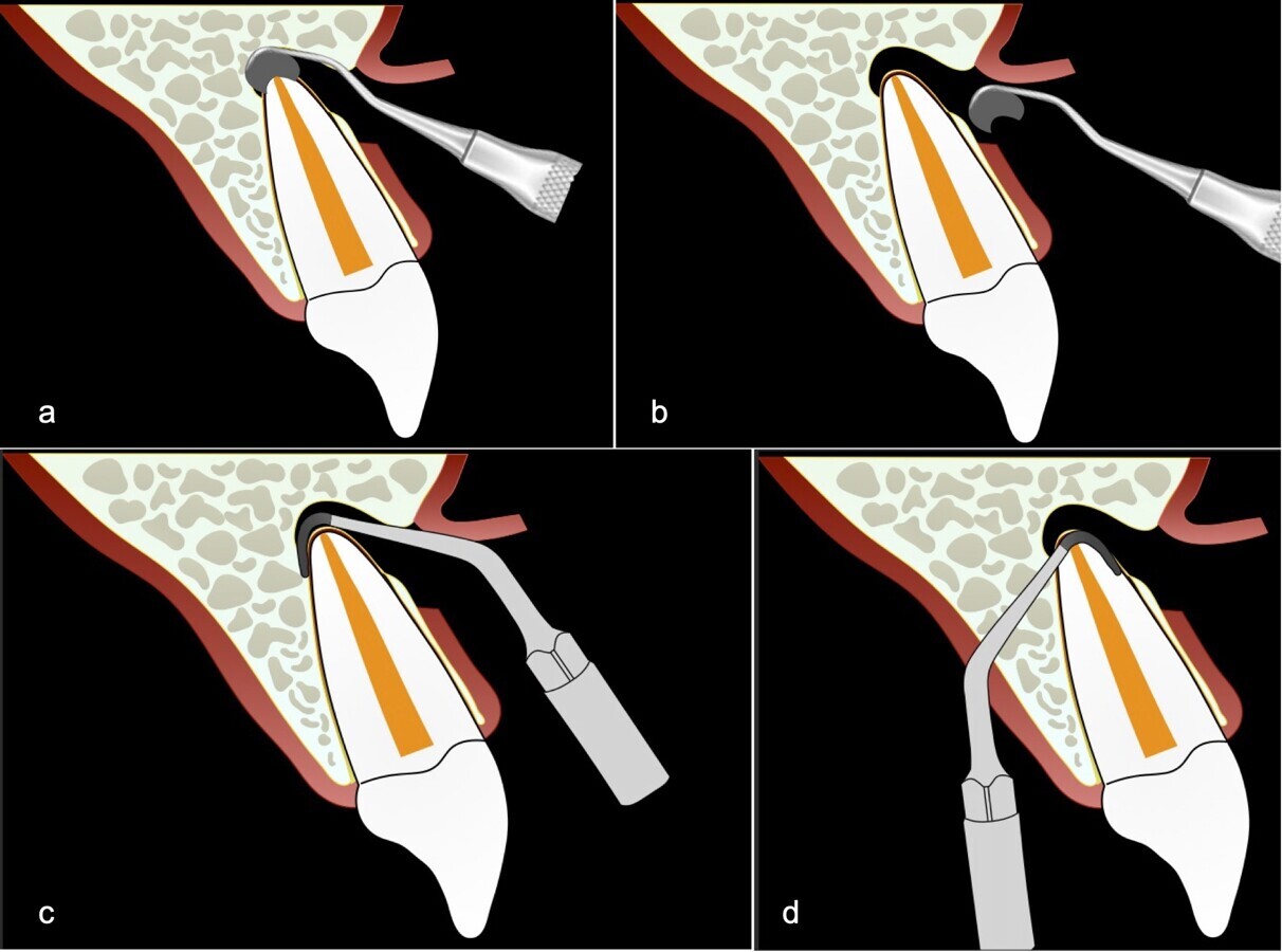 Figura 6. Eliminación mecánica con instrumento manual de tejido granulomatoso (a, b). Limpieza peri radicular del tejido dentario apical y óseo (c, d).