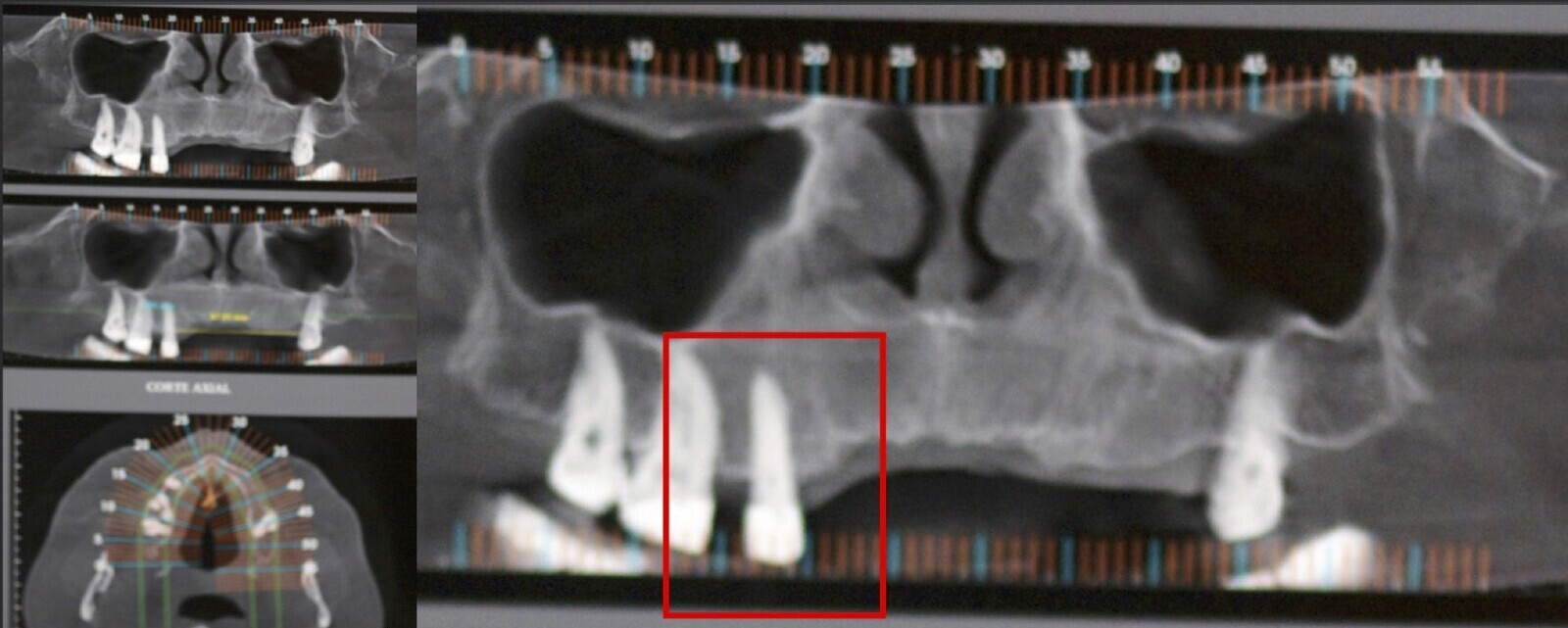 Paciente de sexo femenino de 46 años, llega a la consulta por presentar odontalgia en la pieza 2.1. Al examen clínico se observa restauración coronaria con ausencia de movilidad dentaria y la paciente refiere dolor a la percusión vertical. En la evaluación tomográfica se observó tratamiento de conducto radicular y espigo intrarradicular acompañado de imagen hipodensa a nivel apical compatible con proceso infeccioso crónico. Se procede a realizar apicectomía mediante técnica por desgaste, finalizando con la preparación y obturación de conducto radicular apical por vía retrógrada.