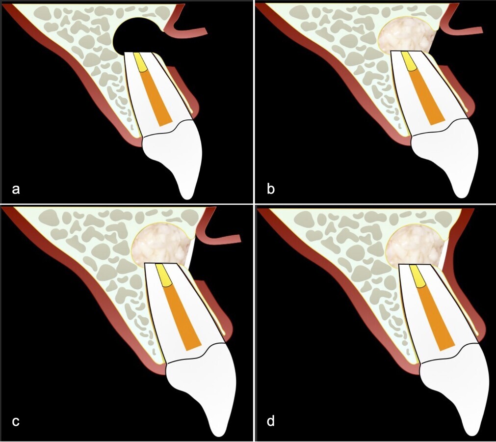 Figura 10. Obturación del conducto radicular por vía retrógrada apical (a). Colocación de material de relleno óseo y membrana de barrera reabsorvible (b, c). Reposición del colgajo y sutura (d).