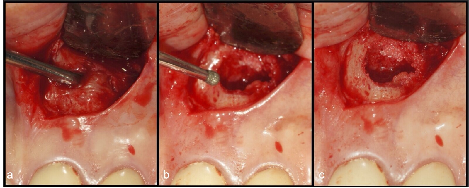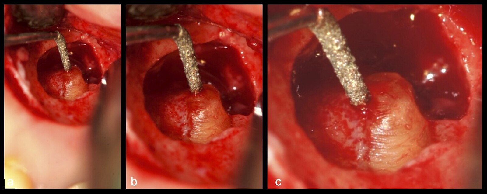 Figura 13. Secuencia de elevación del colgajo semilunar, eliminación de tejido granulomatoso y acceso a la zona periapical de la pieza 2.1 con inserto redondo de punta diamantada (a, b, c).