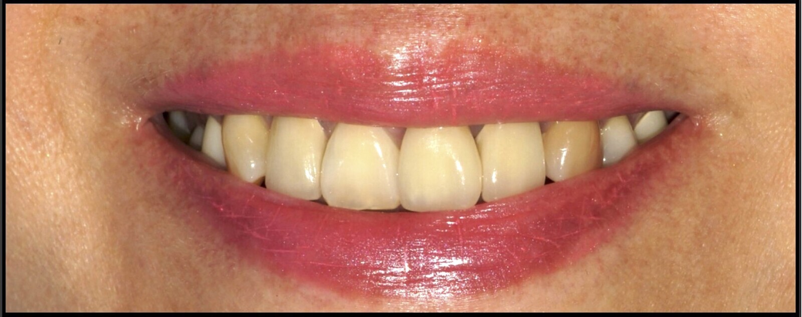 Figura 11. Fotografía frontal en la que el paciente presenta línea de sonrisa baja, y coronas de porcelana definitivas en incisivos superiores.