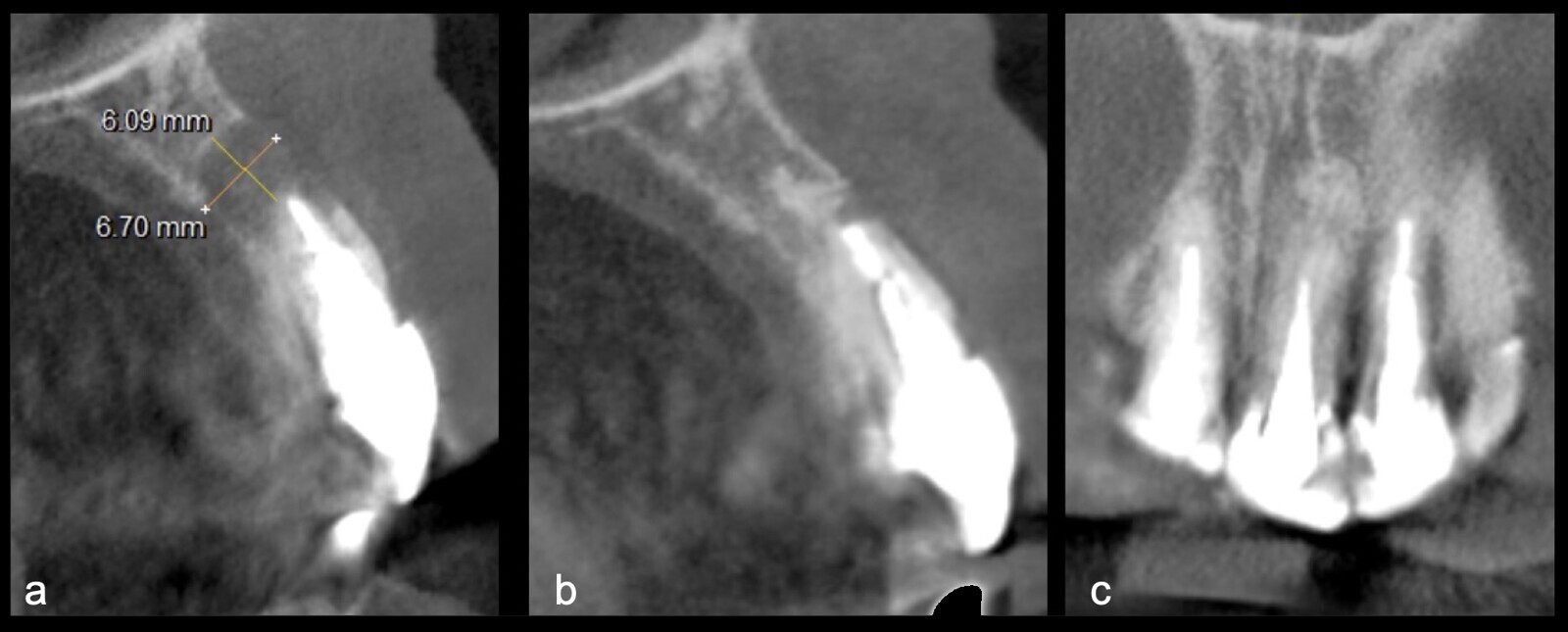 Figura 24. Vista sagital TCCB pieza 2.1. Preoperatorio: imagen hipodensa de 6 mm de diámetro con osteólisis y pérdida de tabla vestibular y palatina (a). Control a los 3 años: imagen hiperdensa compatible con zona regenerada a nivel apical, con presencia de cortical palatina y vestibular (b). Vista coronal TCCB pieza 2.1 control a los 3 años: imagen hiperdensa compatible con hueso en proceso de reparación, presencia de cortical palatina y vestibular (c).