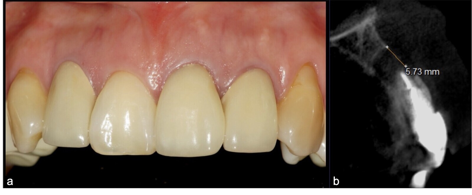 Figura 12. Fotografía frontal: restauraciones cerámicas definitivas, con ausencia de lesiones fistulosas (a). Corte sagital de TCCB pieza 2.1: imagen hipodensa compatible con lesión periapical osteolítica de aproximadamente 5.73 cm de diámetro, con compromiso de la tabla vestibular y palatina (b).