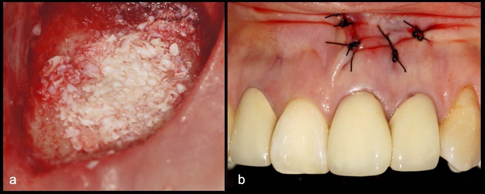 Figura 21. Injerto en bloque (a, b) combinado con antibiótico (clindamicina, tetraciclina).