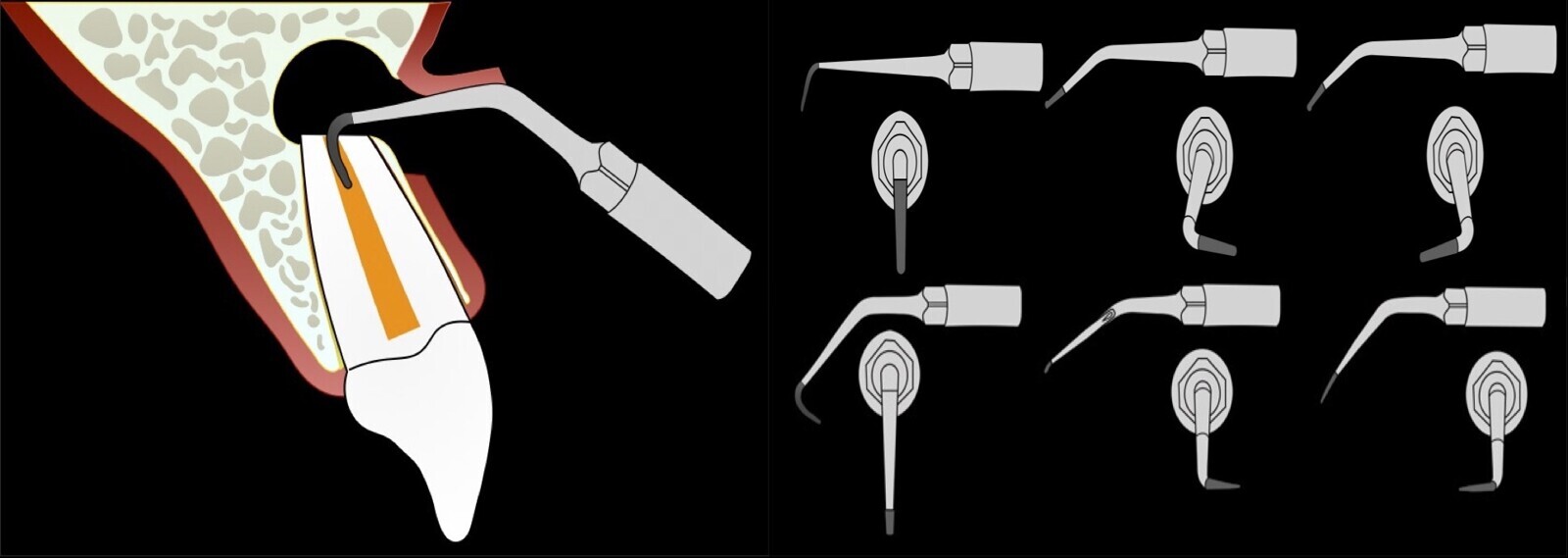 Si el tratamiento de conducto previo es reciente y no está contaminado, se procede al cierre de la herida, previa evaluación de la necesidad de material de regeneración ósea en la zona. Si el tratamiento de conducto previo es de larga data y se encuentra contaminado, se procede a la preparación apical de la zona con los kits de insertos endodónticos, a una profundidad de 3 a 4 mm19 y mediante un movimiento vertical vibratorio constante sin pulsaciones que puedan causar microgrietas en la superficie.20 Los insertos especializados poseen diferentes angulaciones y configuraciones, lo que aporta versatilidad al proceso. La conformación más usada es la del inserto angulado de extremo troncocónico sin o con superficie diamantada con grano de 30 um en los milímetros finales. Tiene como función principal la limpieza y conformación del canal (Figura 9).