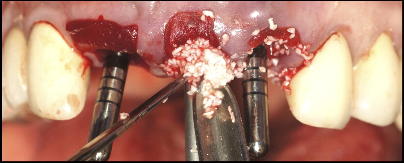 Figura 23. Colocación de biomaterial óseo bovino en del espacio generado entre el pin de paralelismo y la membrana. Se debe considerar que, a mayor espacio remanente, mayor será el grosor de la nueva tabla ósea vestibular.