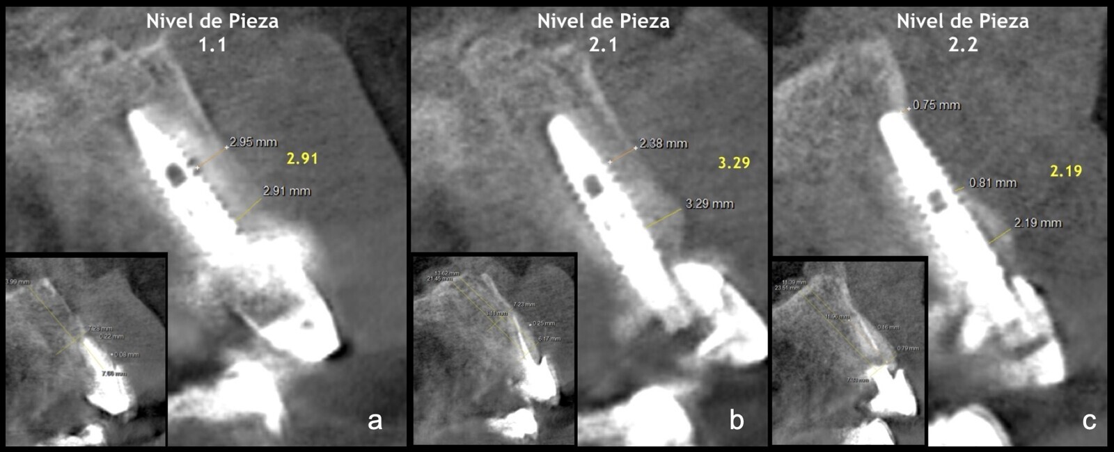 Figura 32. Control a los 4 meses post quirúrgicos (a), donde se evidencia la formación de una nueva tabla ósea vestibular crestal (b), mayor a 2 mm en todos los implantes colocados (c).