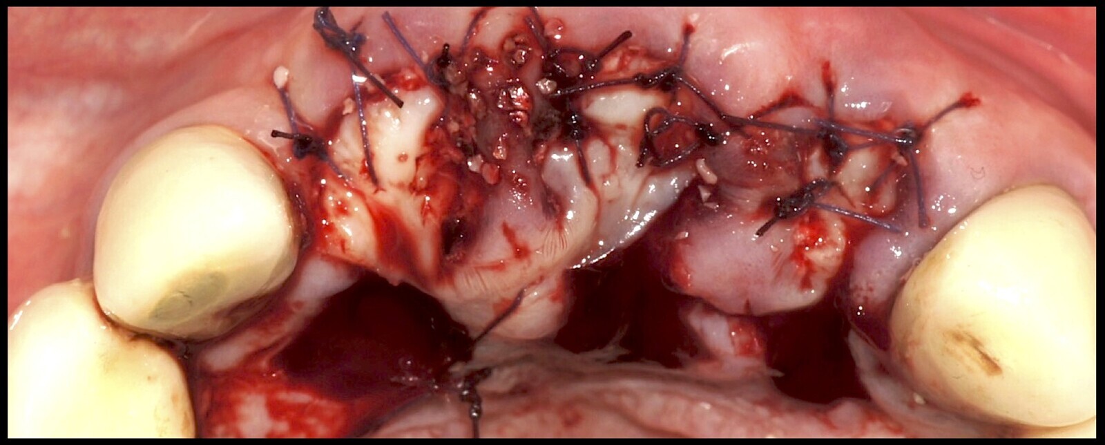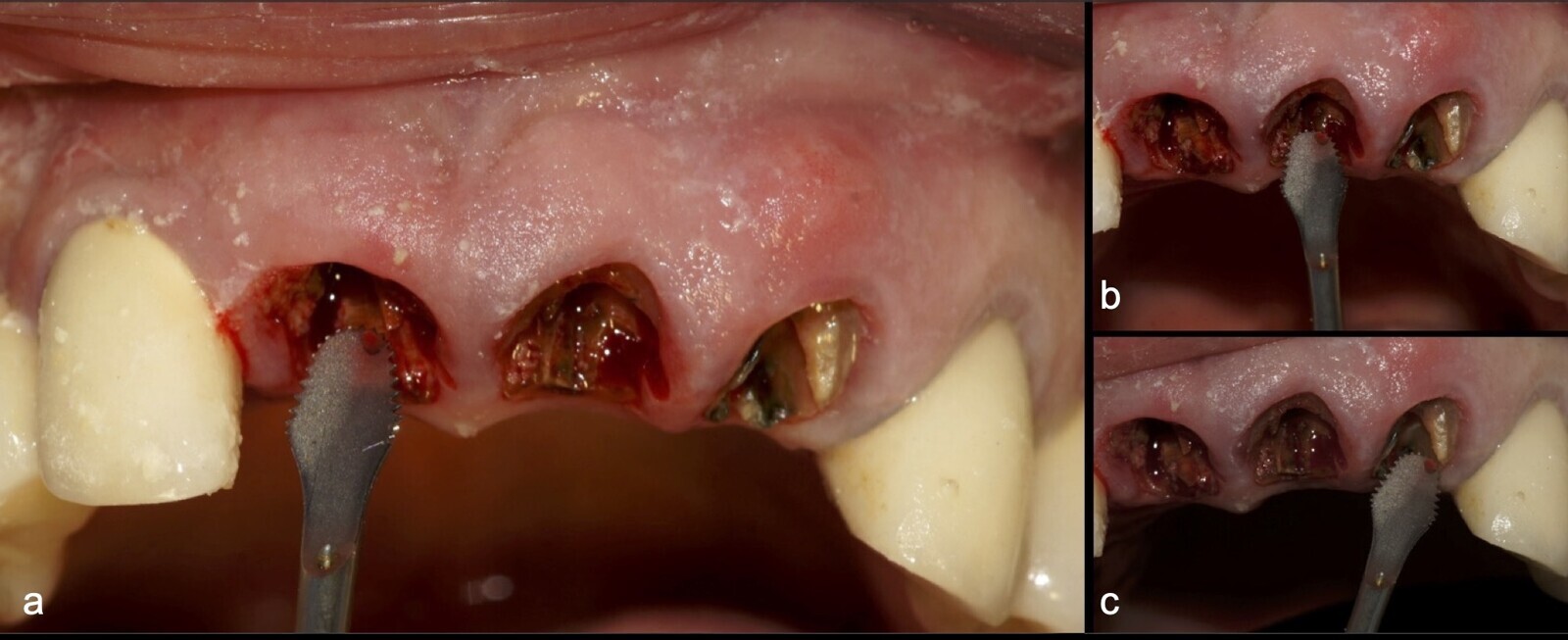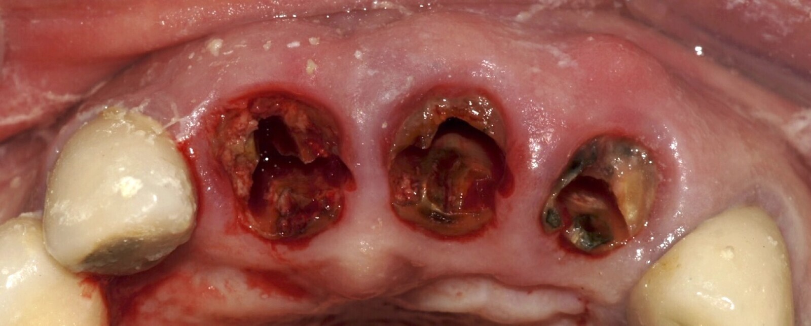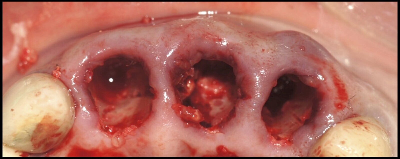 Figura 21. Alveolos de las piezas 1.1, 2.1, 2.2 post extracción con ausencia de tablas óseas vestibulares.