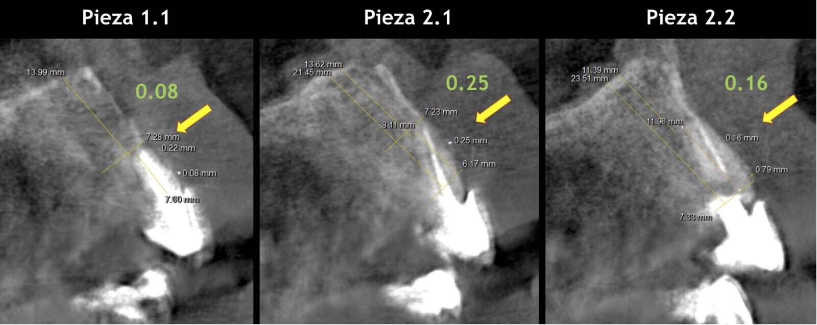 Figura 15. Cortes tomográficos sagitales de las piezas 1.1, 2.1, 2.2. con tablas óseas vestibulares bastante finas menores a 0.2 mm de espesor (a, b, c).