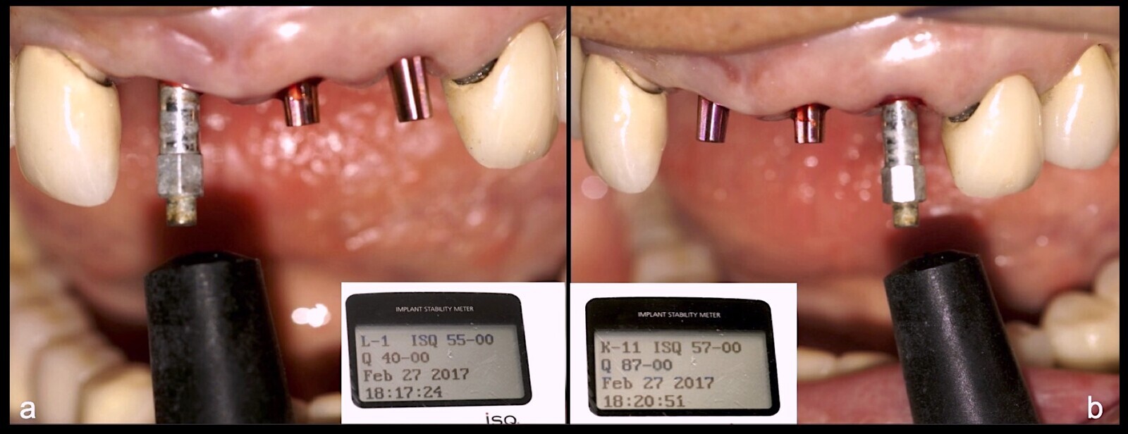 Figura 30. Control de la estabilidad de los implantes con análisis de frecuencia de resonancia. Los valores del ISQ se encuentran entre 55 y 57, lo cual indica que debemos de esperar a una mayor mineralización de la matriz ósea periimplantar (a, b).