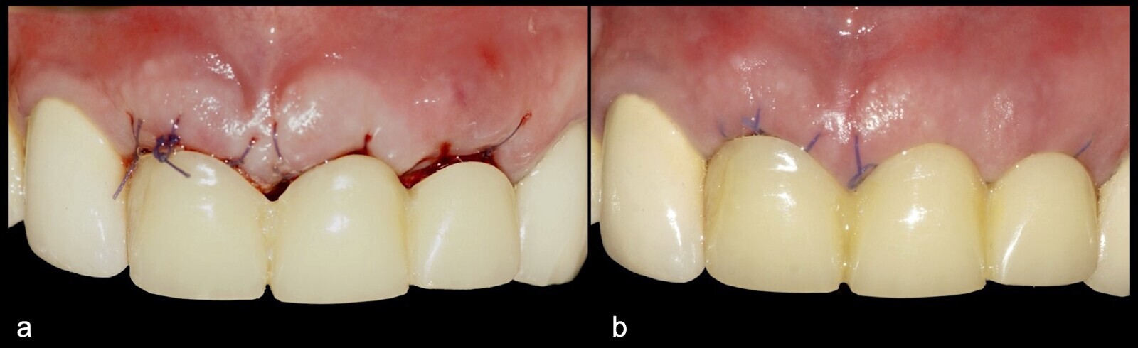 Figura 28. Vista frontal postquirúrgica con una prótesis provisional removible (a). Control al séptimo día, en el que se observa cicatrización favorable gracias a las provisionales de pónticos ováticos, preservación de los contornos de las papilas con cicatrización favorable (b)