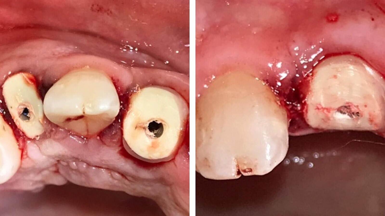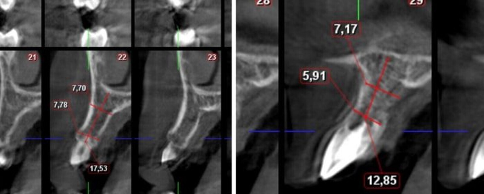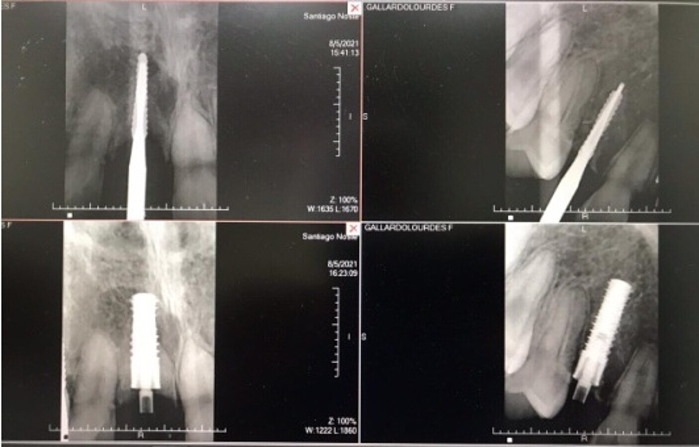 Fig. 3. Tomografía Cone Beam con las mediciones apropiadas.Fig. 4. Pieza 11 con desgastes proximales para la lograr exodoncia no traumática.Fig. 5. Implante rectos NTI colocados sin realizar incisión ni sutura.