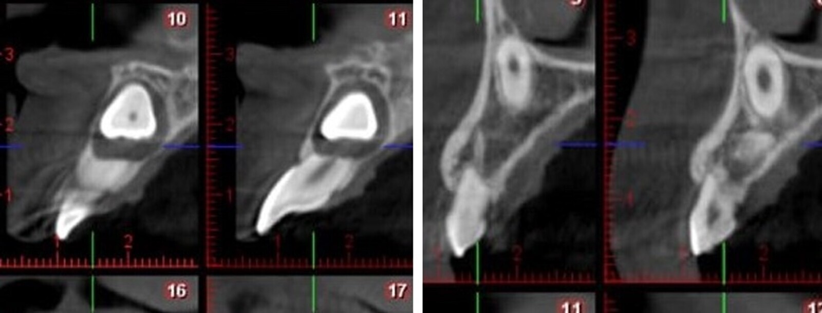 Fig. 2. Tomografía Cone Beam mostrando la reabsorción radicular de 11 y 53.