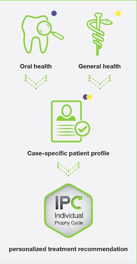 Para ello, se recomienda seguir un procedimiento de profilaxis denominado “Individual Prophy Cycle” (IPC), que se basa en un sistema de tratamiento de seis pasos. El IPC se basa primero que nada en el estudio y documentación del historial clínico y del diagnóstico del paciente, lo cual evita posibles contraindicaciones, refuerza la seguridad del tratamiento y permite seleccionar un procedimiento personalizado y específico para sus necesidades.