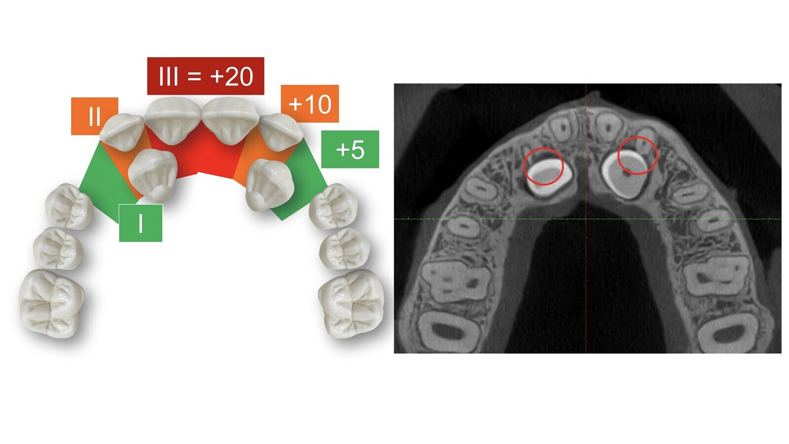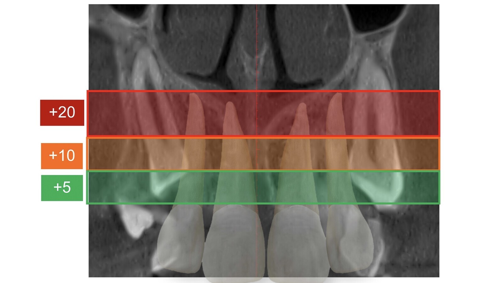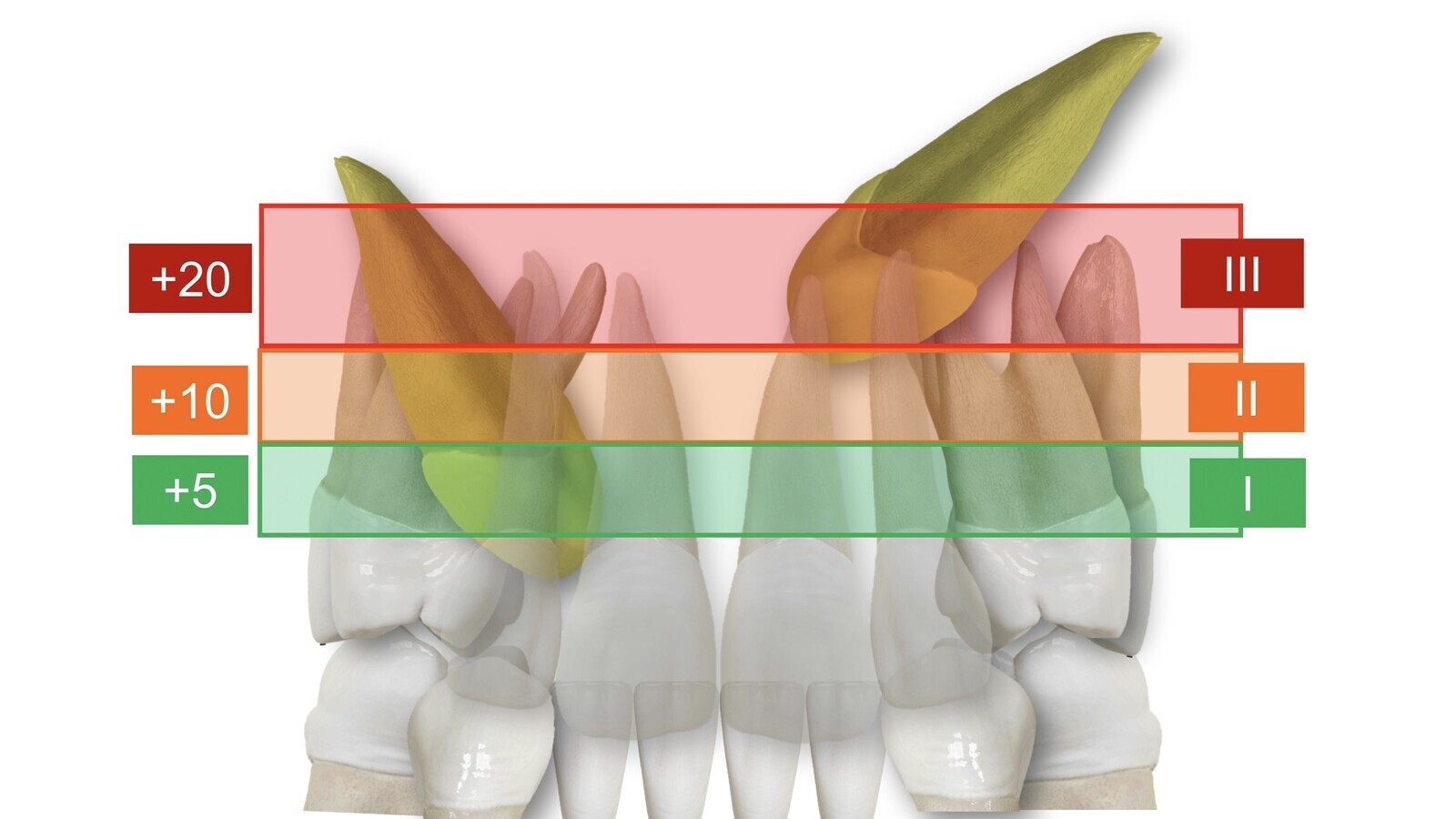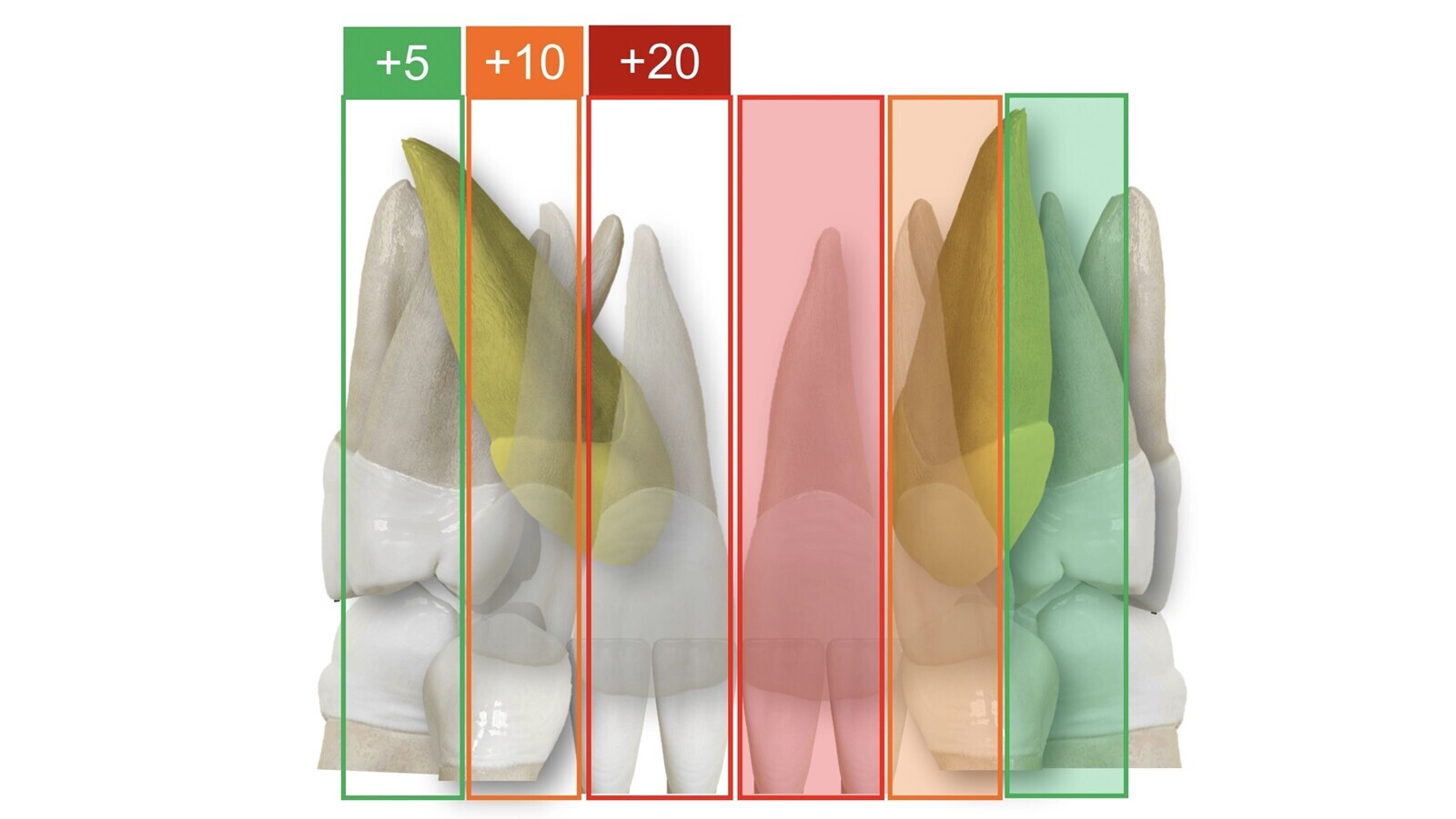 Figura 7. El pronóstico empeora a medida que el canino se aleja de las coronas incisivas en dirección apical. El gráfico indica la posición de la corona del canino respecto a la línea media, de mejor (distal) en verde, a peor (mesial y cerca de la línea media) en rojo.