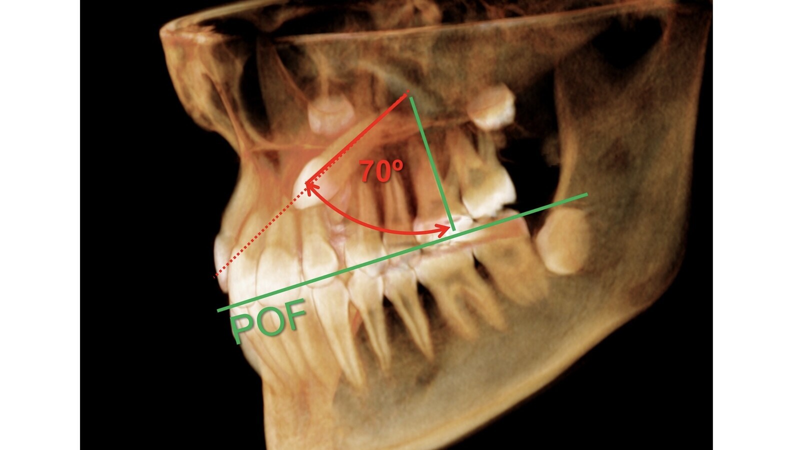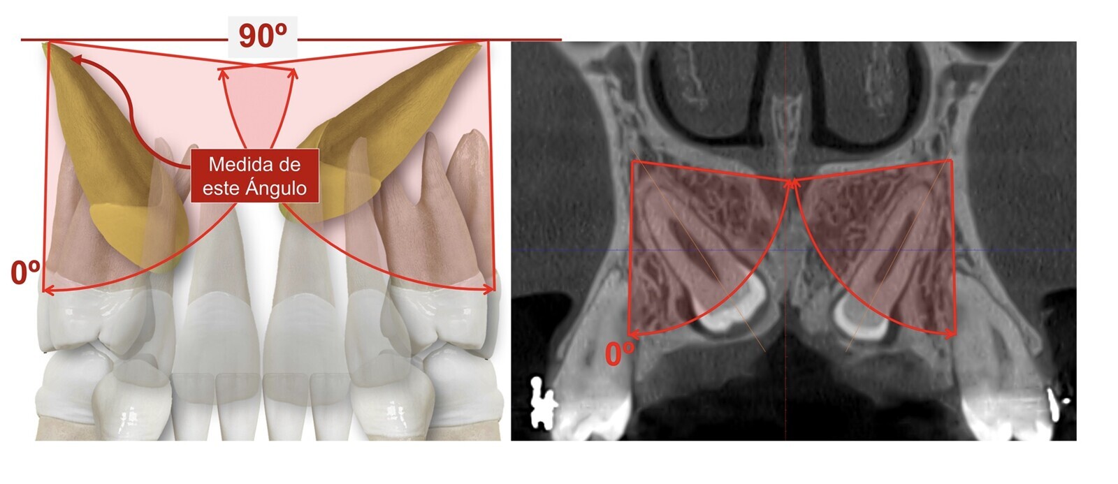 Figura 4. Medir la angulación del canino y la altura de su corona se puede realizar a partir de una perpendicular al plano transversal maxilar.