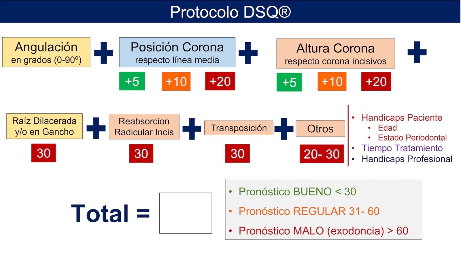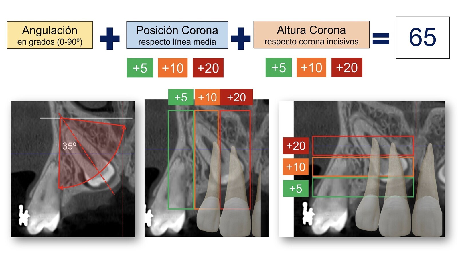 El pronóstico empeora a medida que el canino se aleja de las coronas incisivas en dirección apical. Complemento de lo anterior es la posición de la corona del canino respecto a la línea media, de mejor (distal) en verde a peor (mesial y cerca de la línea media) en rojo (figura 7).
