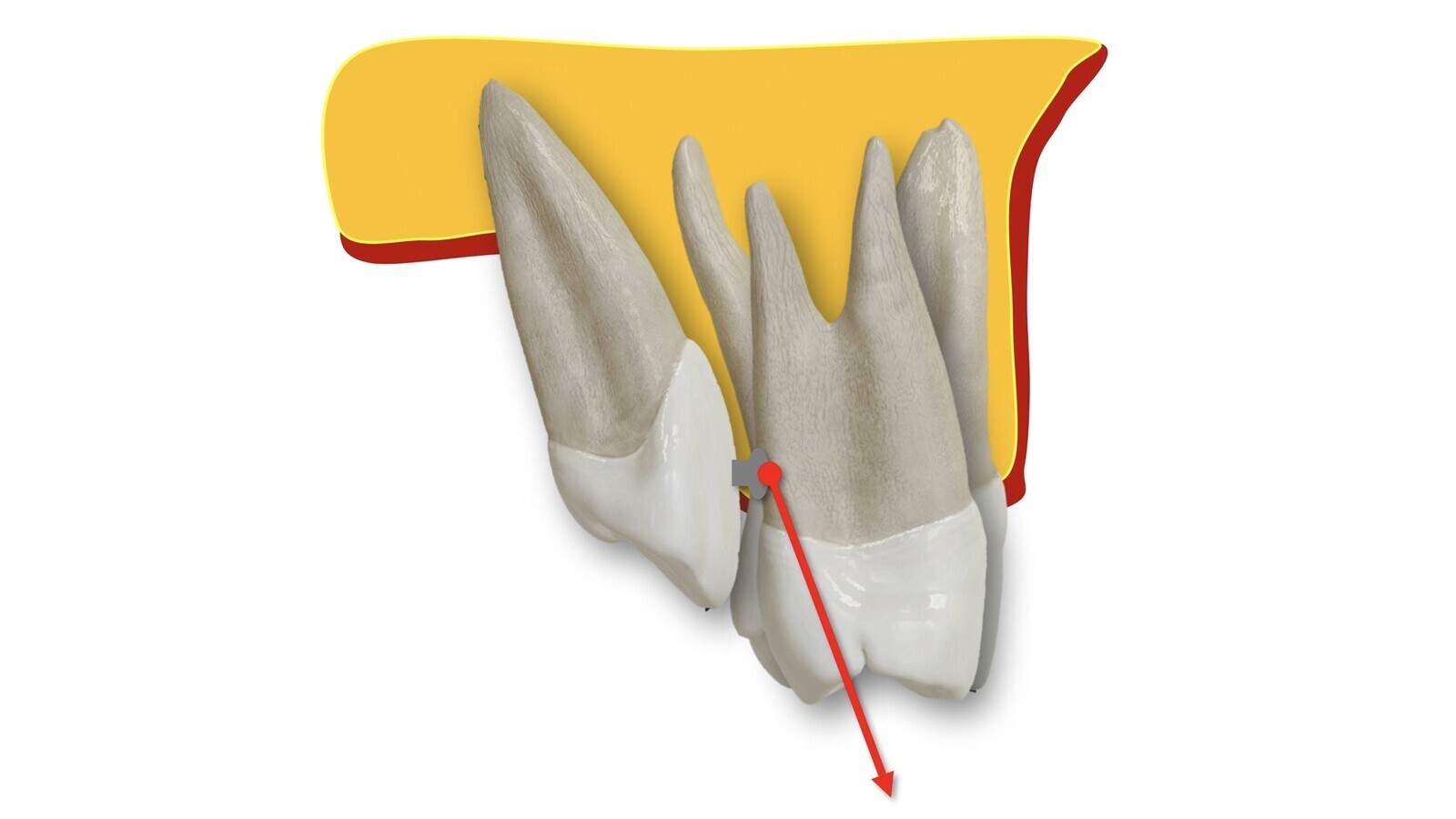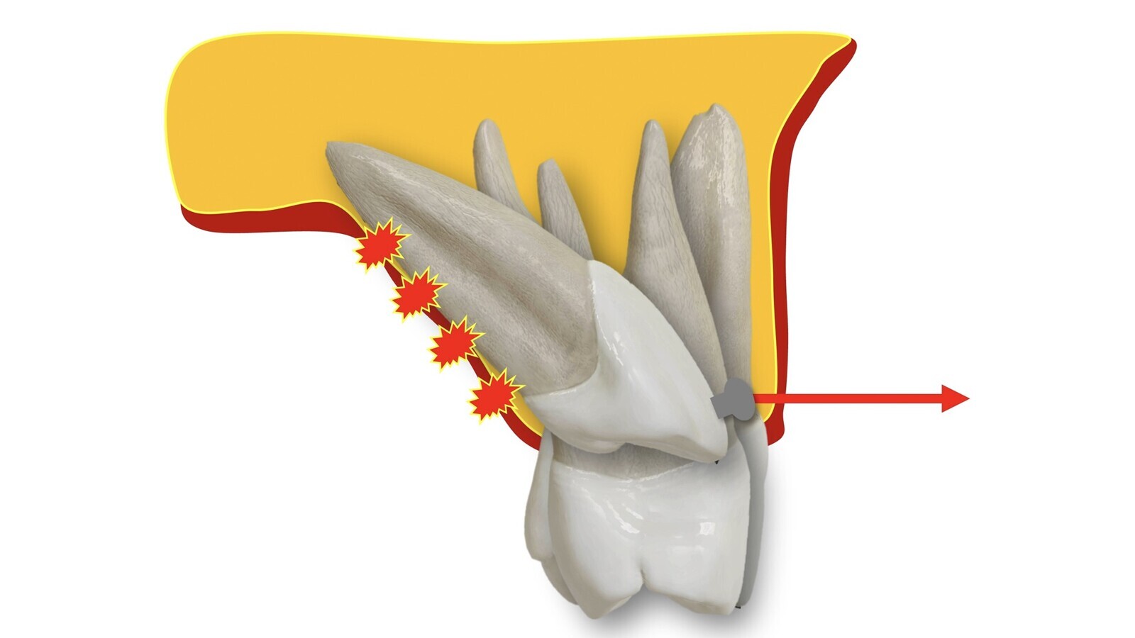Figura 12. Se debe realizar primero tracción vertical y después horizontal. La tracción horizontal sostenida crea los inespecíficos “caninos anquilosados” al acostar al canino sobre la cortical palatina.