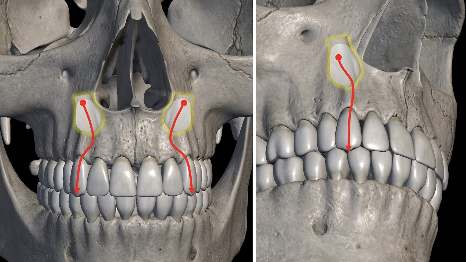 Gran parte de los problemas de los caninos derivan de dos hechos mecánicos: el largo camino que ha de recorrer desde la parte apical de la fosa canina, a los lados de la apertura piriforme, hasta su posición final en la arcada y el ser uno de los últimos dientes en hacer erupción/emergencia en el maxilar (figura 1).