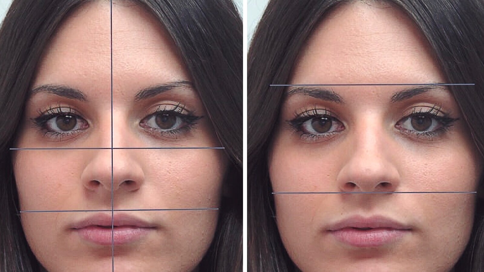 Medición del contorno facial y de las proporciones verticales y horizontales de la cara. Las fotografías deben ser tomadas en posición natural, con el eje bipupilar paralelo al suelo y los labios en reposo para evaluar la simetría facial, vertical y horizontal, así como la relación entre los tercios faciales y la distancia interlabial.