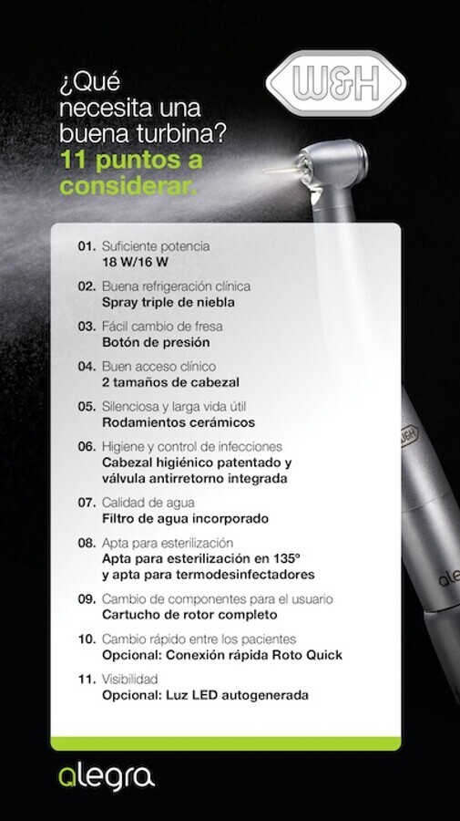 La empresa lista exactamente 11 condiciones que el odontólogo debe tener en cuenta a la hora de seleccionar una turbina, tal se explica a continuación: