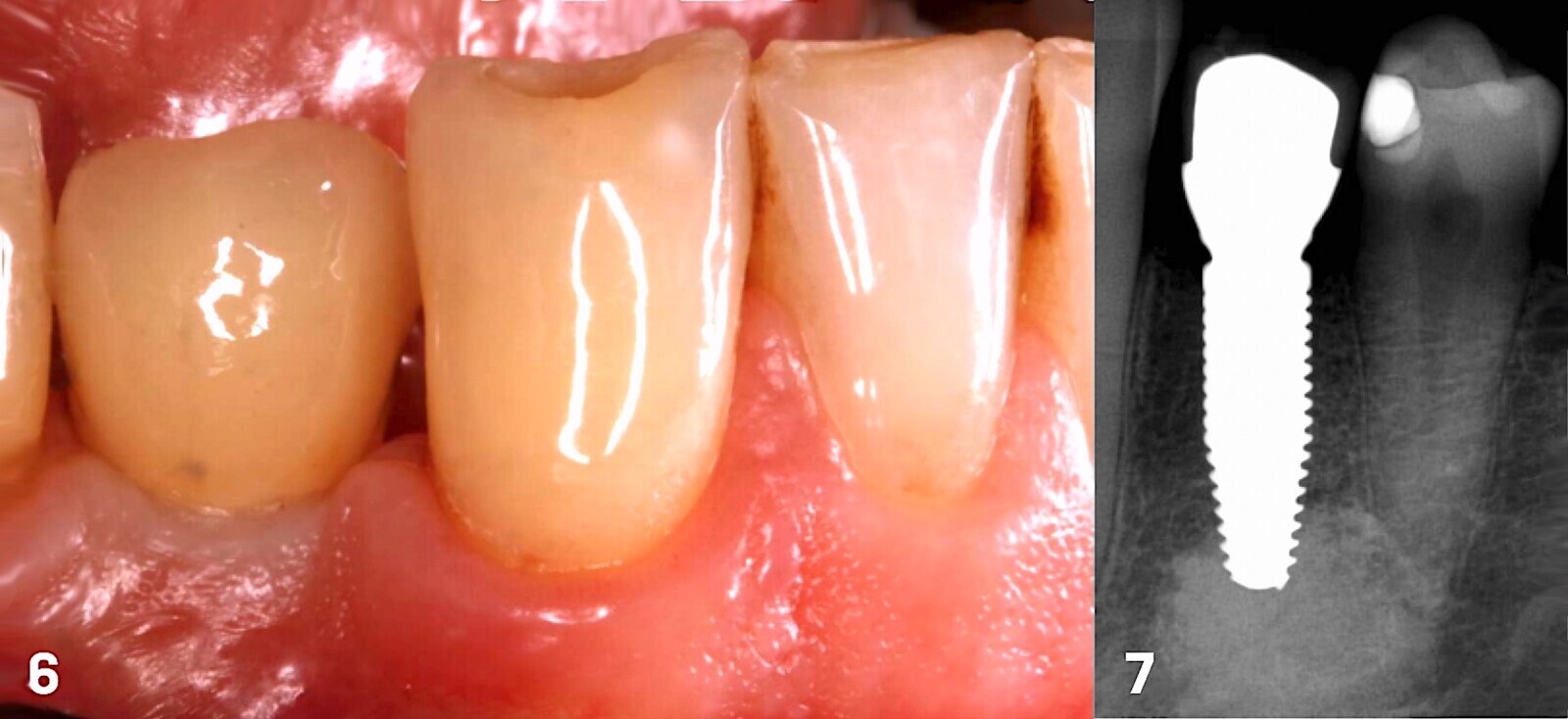 Figuras 6 y 7. Vista lateral de la rehabilitación final y situación radiográfica tras la colocación de la corona final.