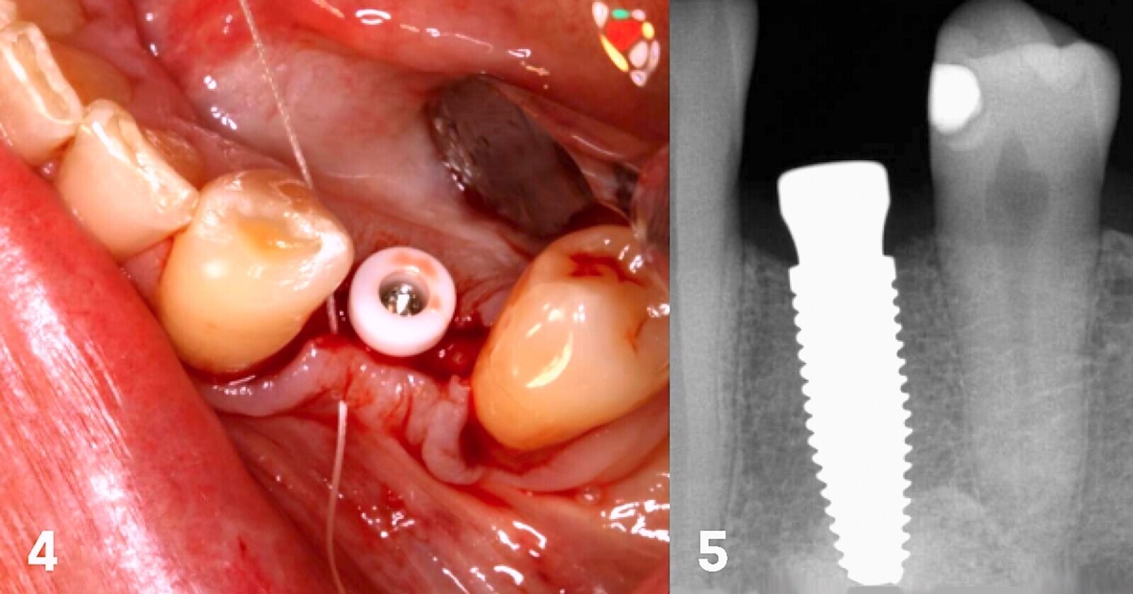 Figuras 4 y 5. Cicatrizador de Zi colocado y situación radiográfica después de la colocación del cicatrizador de Zi.