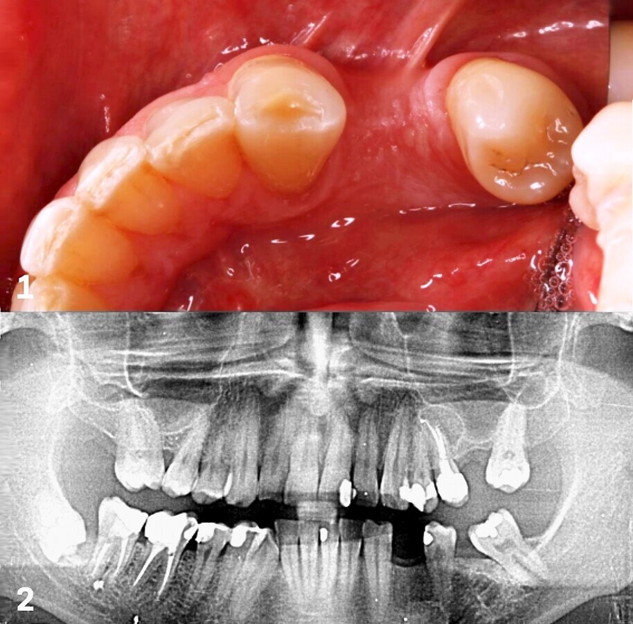Figuras 1 y 2. Situación clínica de la región del diente 34 y situación radiográfica panorámica del paciente.