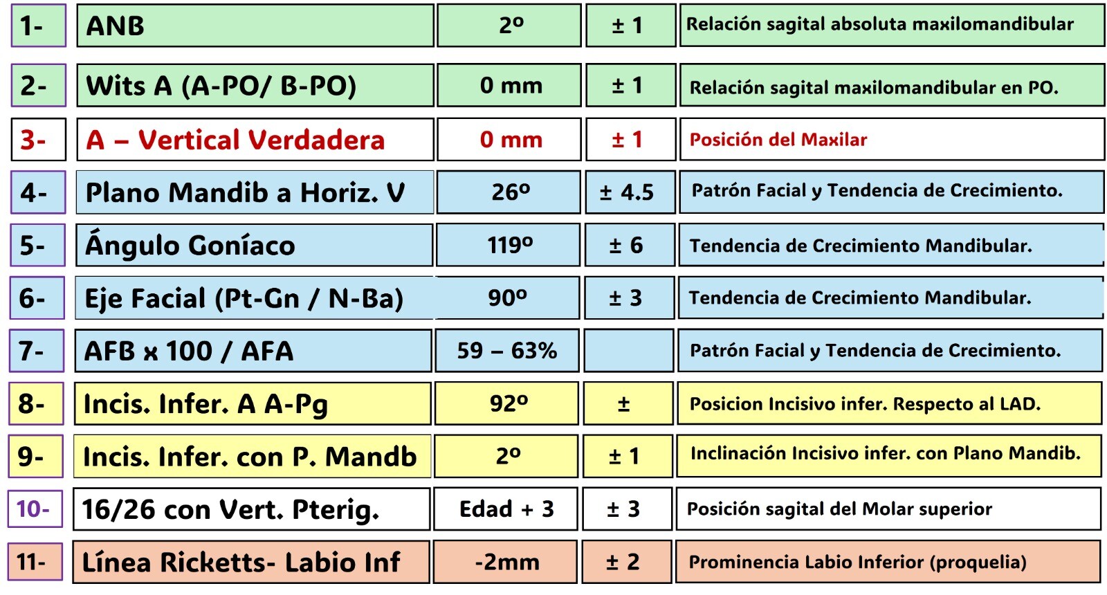 Figura 4. Tabla con las medidas cefalométricas básicas más utilizadas por los autores.