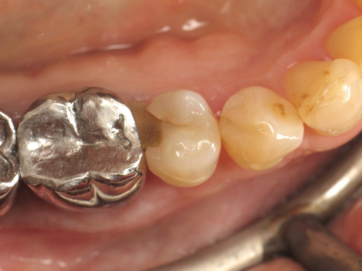Gracias a las excelentes propiedades de aplicación del composite termoviscoso, la restauración no presenta burbujas de aire. Además, existe uniformidad entre los dos composites utilizados en términos de visibilidad de rayos X, y, en general, la restauración presenta un aspecto homogéneo, sin transiciones visibles entre el composite de base fluida y el composite de relleno en bloque. La radiografía preoperatoria no pudo mostrar la extensión completa de la lesión. Solo durante el tratamiento se hizo evidente la necesidad de una preparación exhaustiva para eliminar por completo la estructura dental afectada. Para preservar la vitalidad de la pulpa, se realizó una desensibilización antes de la restauración con composite.