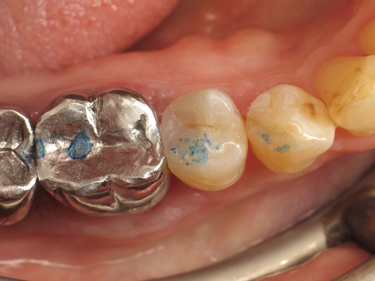 Para ajustar la oclusión, se utiliza papel articular para visualizar los puntos de contacto (Figura 20) y realizar las correcciones necesarias (Figura 21). El resultado final es muy natural (Figura 22).