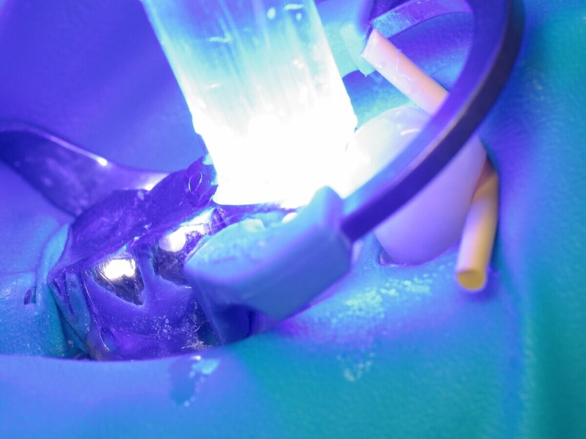El adhesivo (Futurabond DC, VOCO) se aplica a la cavidad durante 20 segundos, se seca durante 5 segundos con un pulverizador de aire sin aceite y, finalmente, se fotopolimeriza durante 10 s segundos (Figuras 8 y 9).