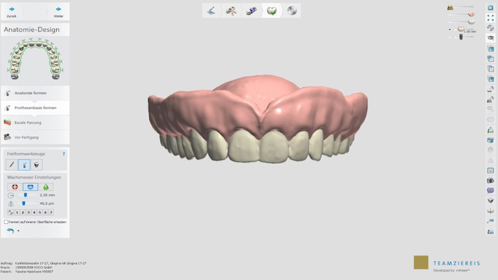 A partir de los archivos STL (Fig.7), el laboratorio imprime en 3D la base utilizando una resina de color gingival (V-Print dentbase, VOCO) y fresa los dientes de un disco de composite (CediTEC DT, VOCO; Fig.8).