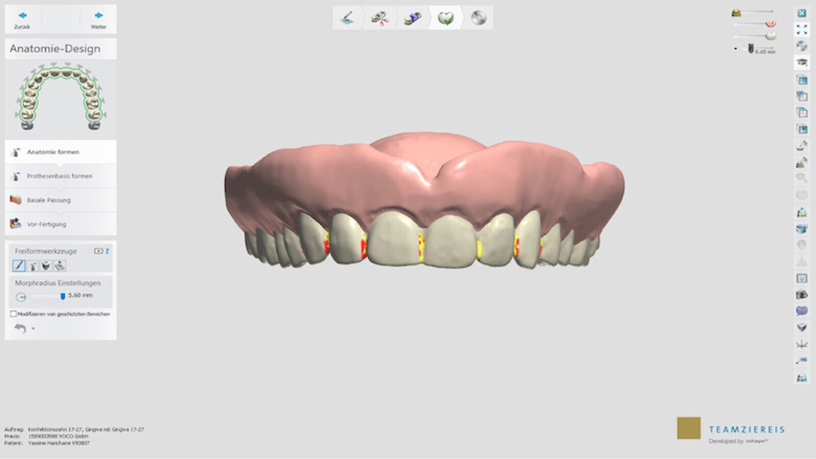 El técnico dental recibe los archivos digitales de la dentadura, el antagonista y la oclusión. Se pueden realizar todos los cambios trabajando en modelos virtuales (3Shape Dental System). A partir de las fotografías del paciente, el protésico, con la orientación del clínico, es capaz de determinar los cambios a realizar en la dentadura: aumentar o disminuir la varilla incisal, modificar la anatomía de los dientes, corregir un posible defecto de la inclinación del plano oclusal, e incluso mejorar la curva de la sonrisa. El técnico dental puede también mejorar digitalmente la apariencia de la encía falsa creando un bulto bucal, simulando raíces dentales (Figs. 4 y 5).