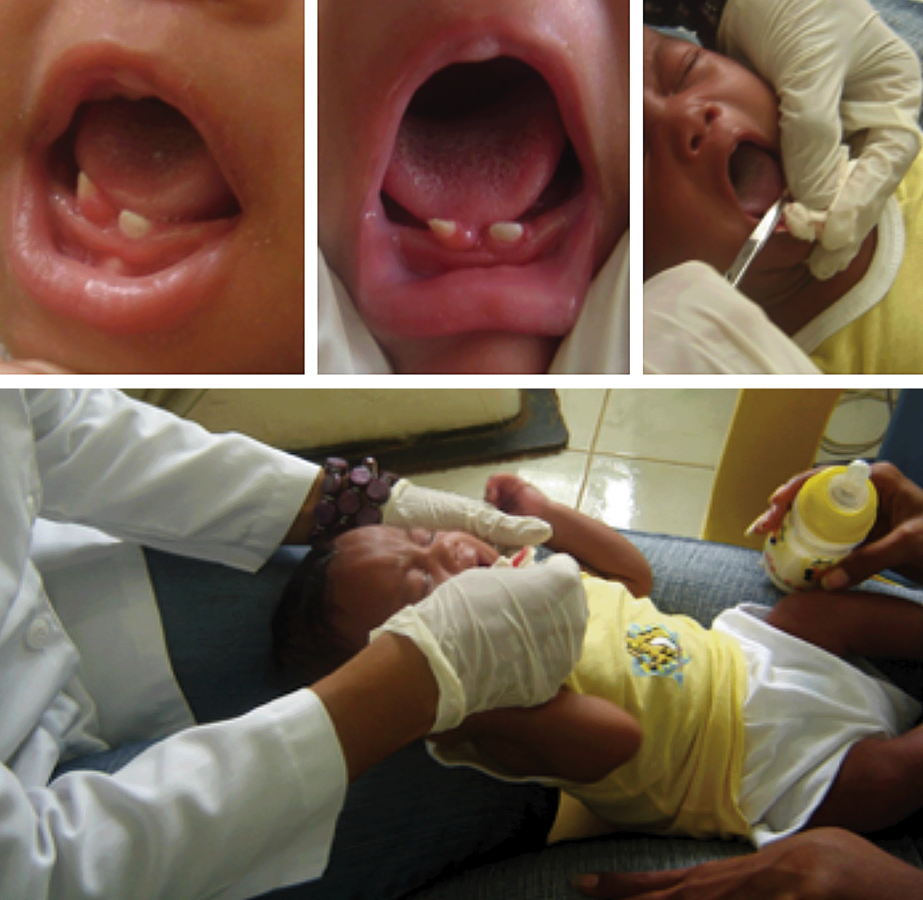 En la actualidad los niños nacidos en centros hospitalarios o con control pediátrico (de partos institucionalizados) reciben dosis de vitamina K, lo cual compensa su ausencia en el nacimiento)1. La extracción se realiza en el consultorio, con anestesia local (tópica o infiltrativa, según el caso), en brazos del padre o la madre, en una camilla o en posición de rodilla-rodilla, e inmediatamente después de la exodoncia se indica a la madre dar de mamar al bebé para disminuir la angustia7 y favorecer la cicatrización (Figura 2)1.