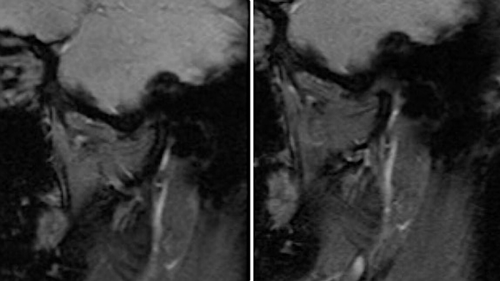 Figs. 1a-1b. Cortes sagitales de Resonancia Magnética de la ATM derecha, donde se puede observar la presencia de un Desplazamiento de Disco sin Reducción.