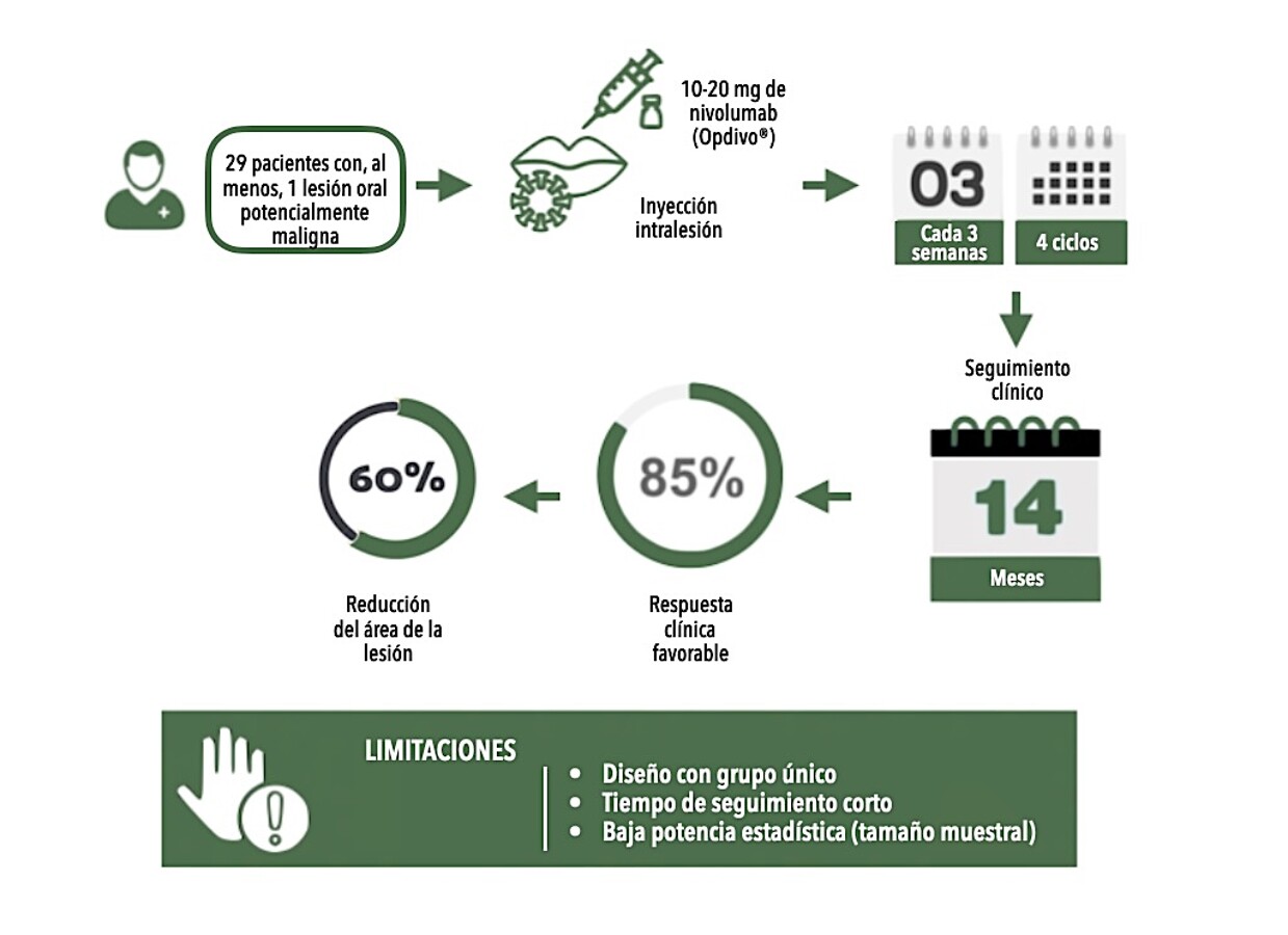 El Dr. Moran Amit, cirujano y profesor adjunto del Centro Oncológico MD Anderson de la Universidad de Texas, ha explicado que en dicho ensayo se incluyeron 29 pacientes con, al menos, una lesión oral potencialmente maligna no tratada. Estos pacientes recibieron 10 mg o 20 mg de nivolumab inyectados directamente en una de sus lesiones orales cada tres semanas durante un total de cuatro ciclos.