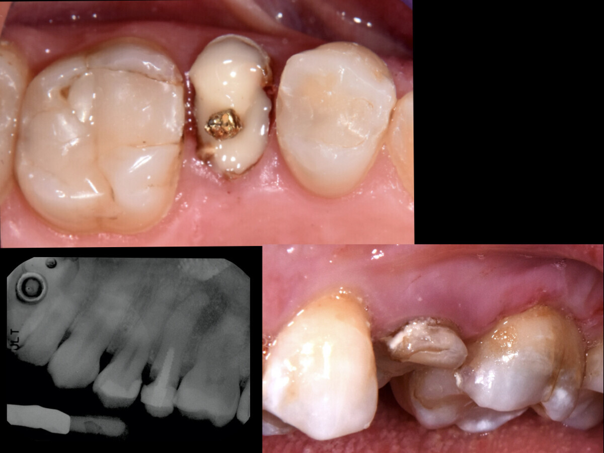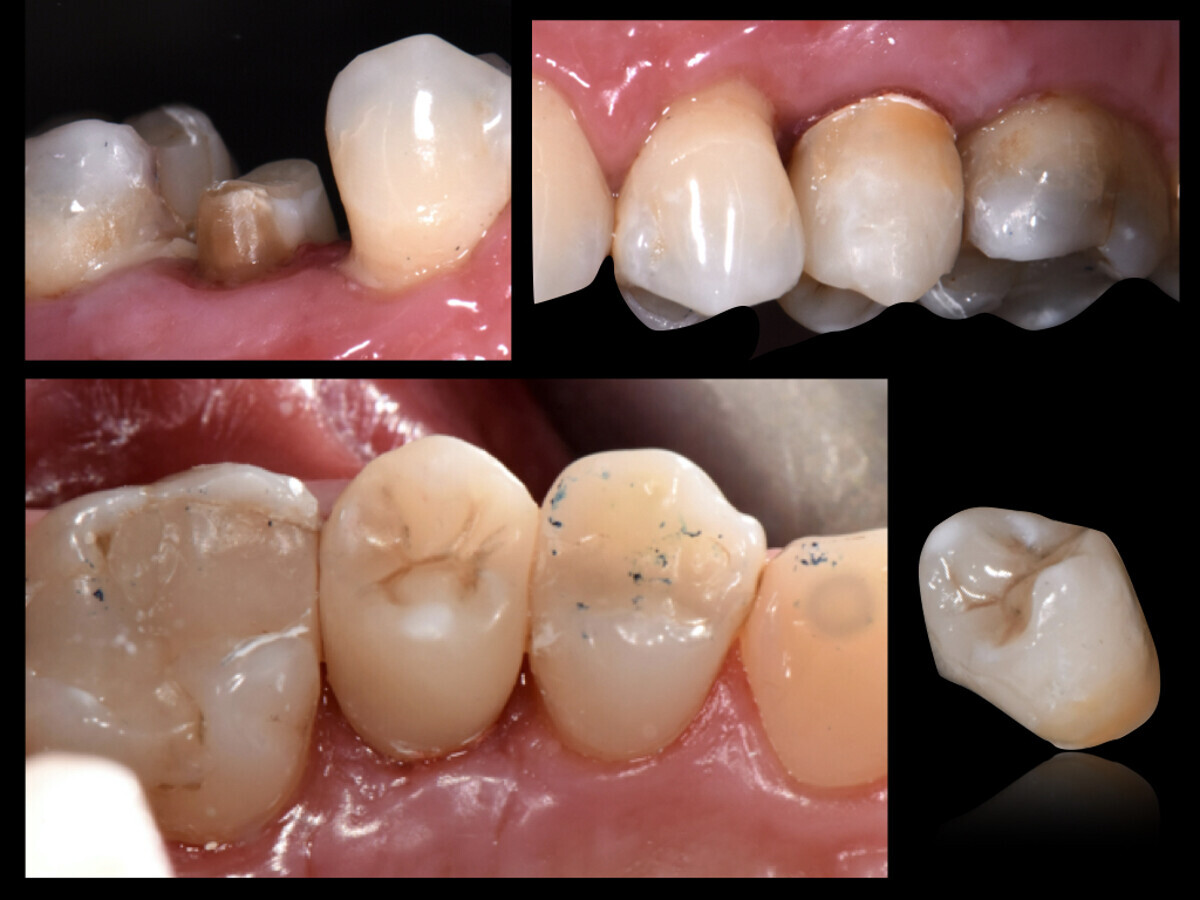 Comparación de la situación antes y después: las fases más complejas y que requirieron más tiempo del tratamiento fueron la restauración del efecto de cincho protésico adecuado y la reconstrucción adhesiva del muñón. De esta forma se cementó una corona de resina de manera provisional pero estable, y con ello se restableció la función del resto de la raíz de la pieza 25 durante la masticación, lo que ya no sucedía anteriormente (véase Fig. 1 y 4).