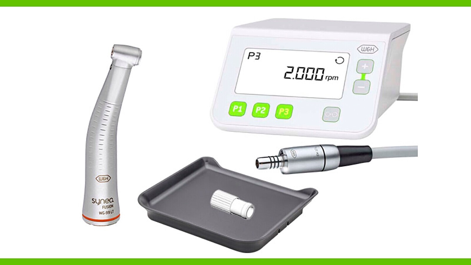El set del Micromotor eléctrico EM-12 L viene con la Unidad de control MF-100, el Contra-ángulo multiplicador Synea WG-99 LT, el Adaptador Borden, una Bandeja esterilizable y un segundo Contra-ángulo gratis de la línea Synea Power Edition. Foto: W&H
