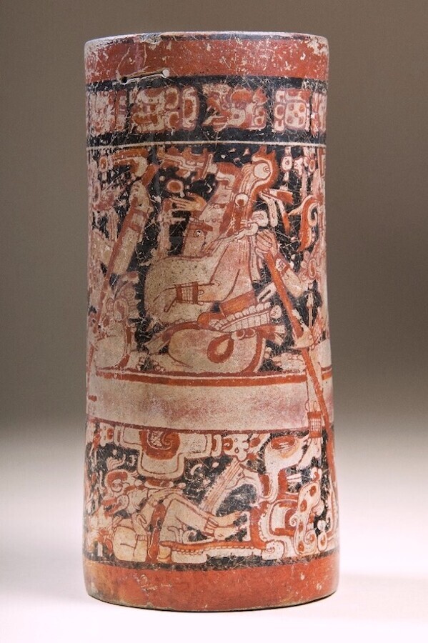 El "Vaso de los Dioses Remeros" narra la muerte y el renacimiento del Dios del Maíz. Se trata de una pieza excepcional del Periodo Clásico Tardío (700-900 d. C.) hallada en las Tierras Bajas Mayas de Guatemala. Colección del Museo Popol Vuh, Universidad Francisco Marroquín. (Fotografía: Jorge Pérez de Lara)
