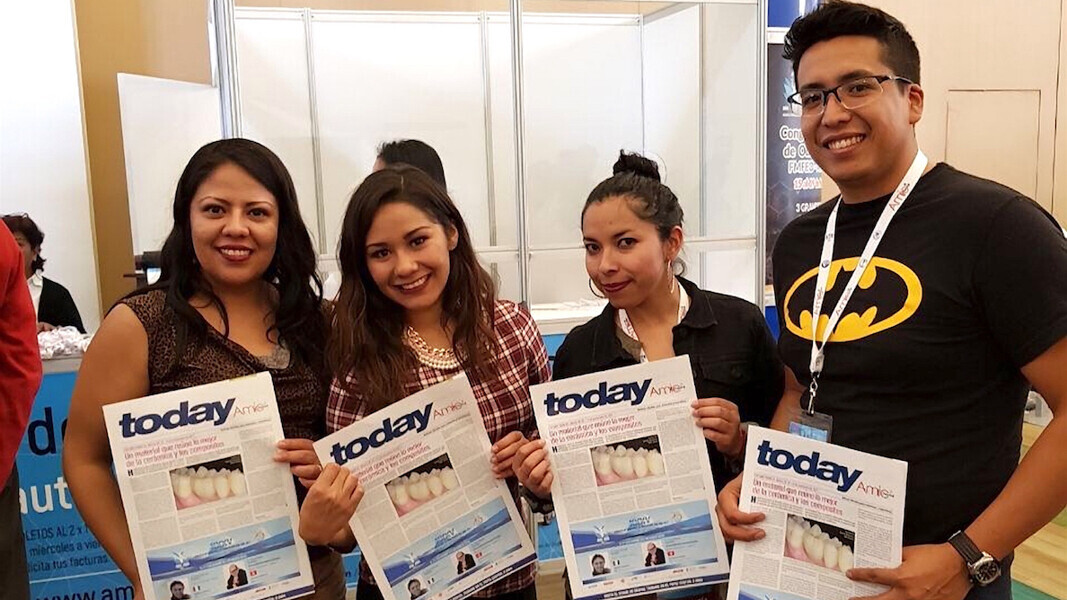 El Dr. Víctor Díaz Michel sostiene el ejemplar de Dental Tribune con su entrevista rodeado de sus estudiantes de UNAM.