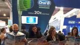 Un grupo de expertos de Oral-B lee Dental Tribune frente a su stand.