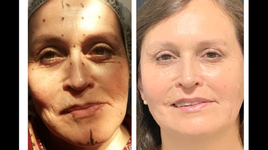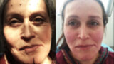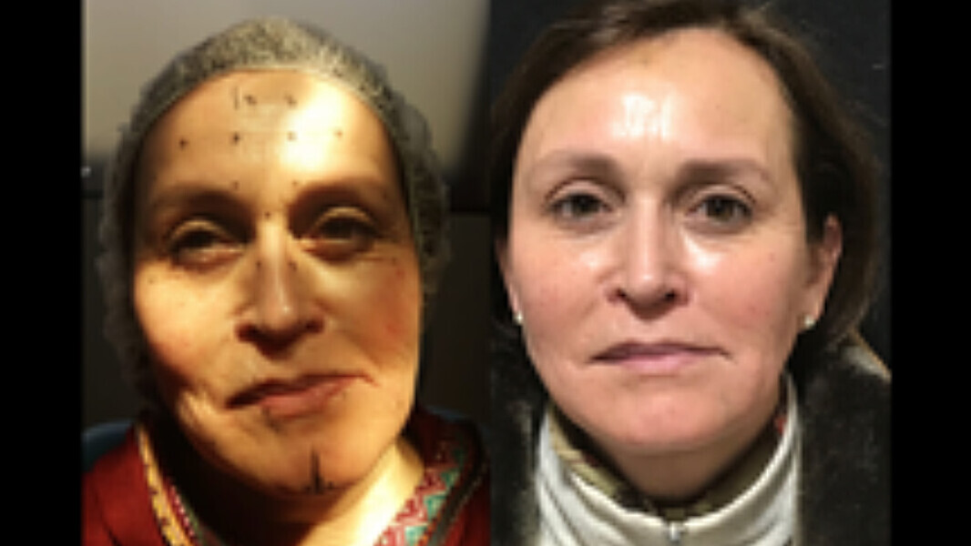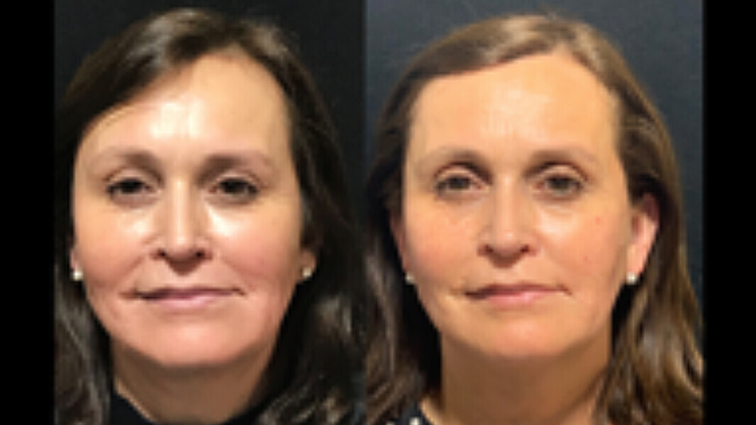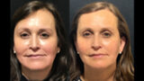 Foto 6. Paciente al día 21 (izquierda) y control a los 7 meses (derecha). Se observa la reaparición de arrugas faciales estáticas, pero de menor profundidad y cantidad que en foto 1. Se planifica re-aplicación de toxina botulínica, mejoramiento de ojo hueco y aplicación de hilos de revitalización PDO y de sustentación o tensión Silhouette Soft.