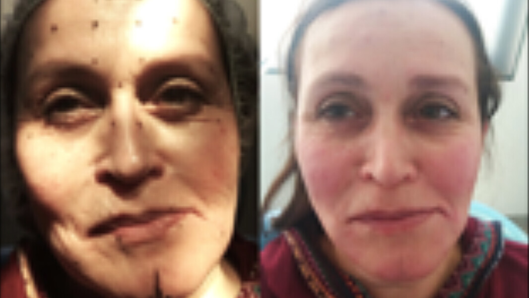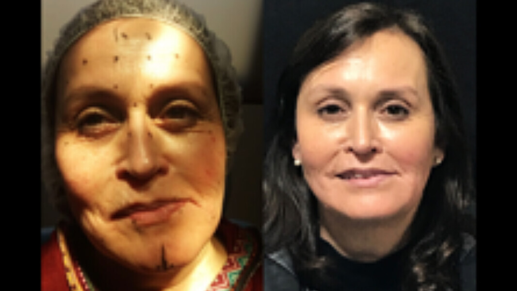 Foto 8. Comparación de inicio de tratamiento(izquierda) y a los 7 meses 15 días de post tratamiento (derecha) con hilos y efecto de toxina botulínica (segunda aplicación). Aún se observa equimosis de tratamiento de hilos revitalizantes peribucales. Nótese el mejoramiento general y aspecto de la mirada de paciente. Ella y su familia están felices con la mejora lograda.