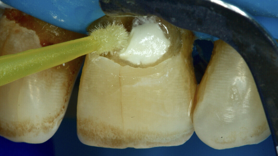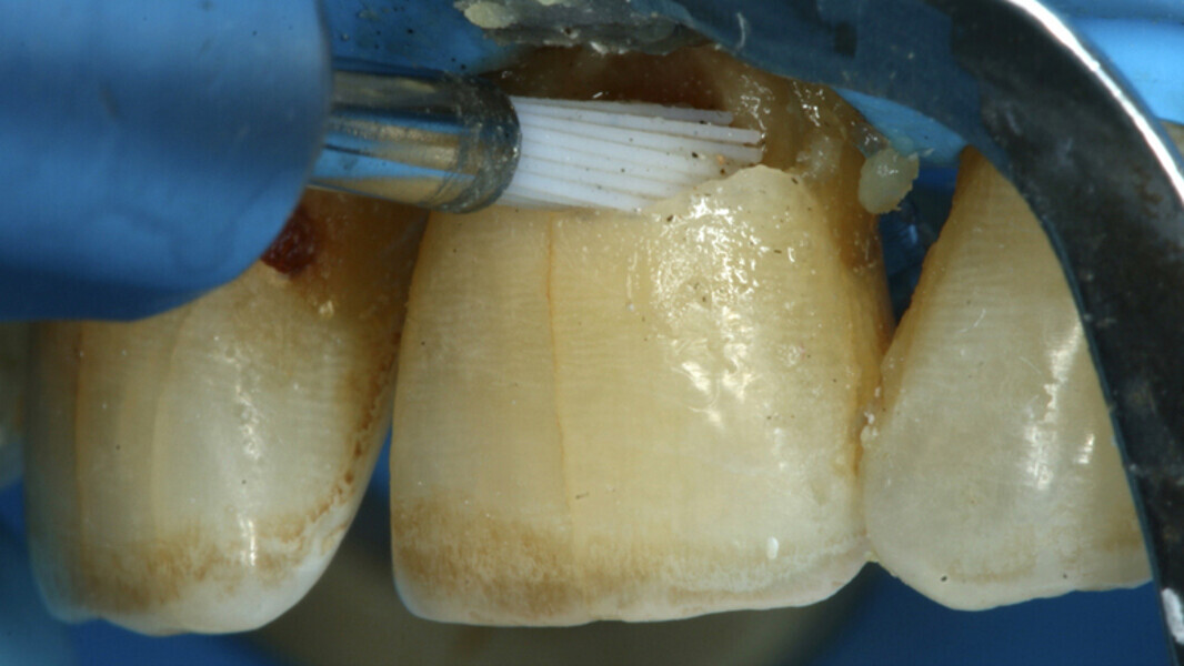 Figura 10. Se lava la cavidad con un micro-cepillo con piedra pómez y clorhexidina 0,12%.