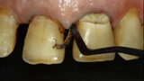 Figuras 2 y 3. Se colocan dos hilos retractores 000 y 00 Ultrapack y aislamiento absoluto con hilo dental tipo teflón y un clamp para dientes anteriores debido a que la lesión se extiende infra-gingivalmente.