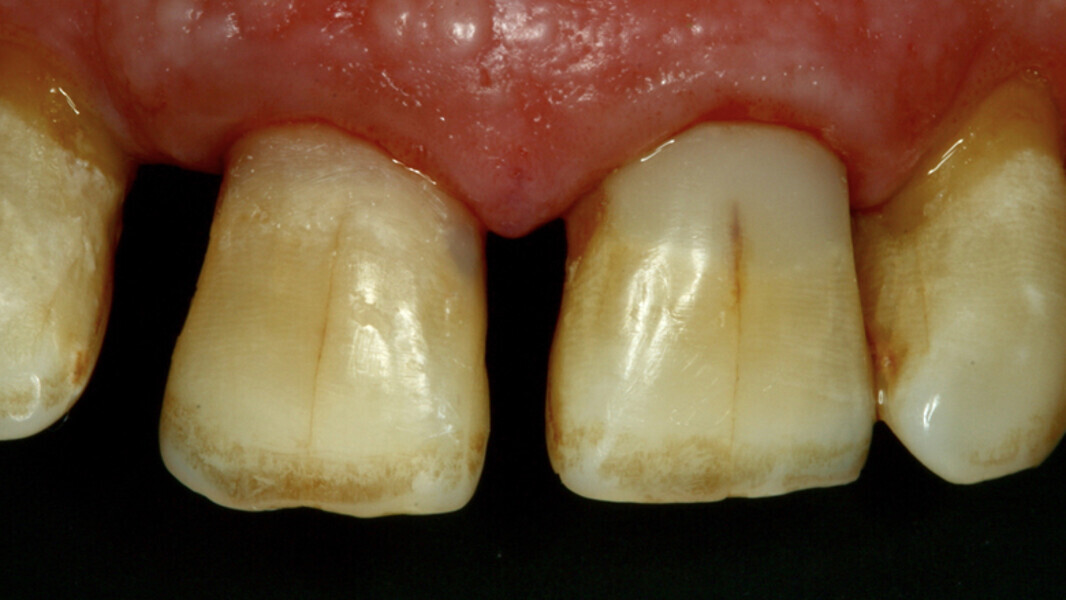 Figura 1. Lesiones de caries cavitadas en dentina activa (ICDAS 5) en dientes 11 y 21 en paciente másculino (Caso 1).