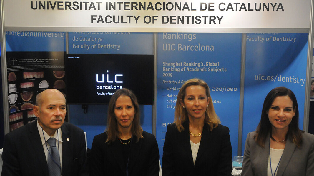 El Dr. Luis Giner, Decano de la Universidad Internacional de Cataluña, y Elisa Sanagustín, Gestora del Centro (segunda por la derecha) promovieron en GNYDM los cursos internacionales que ofrece la universidad. (Foto: José Antonio Rosario para Dental Tribune)