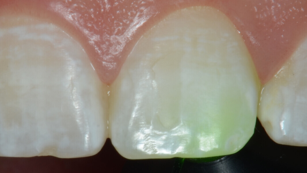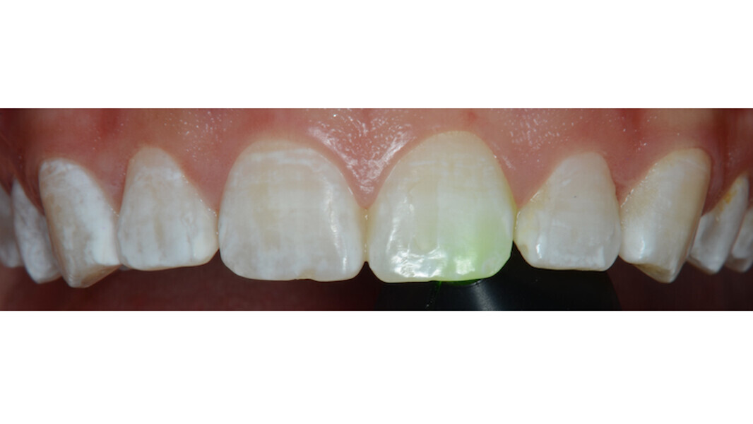Foto 5. Diente 11. Mediante transiluminación se observa la poca profundidad de las lesiones con un buen pronóstico.
